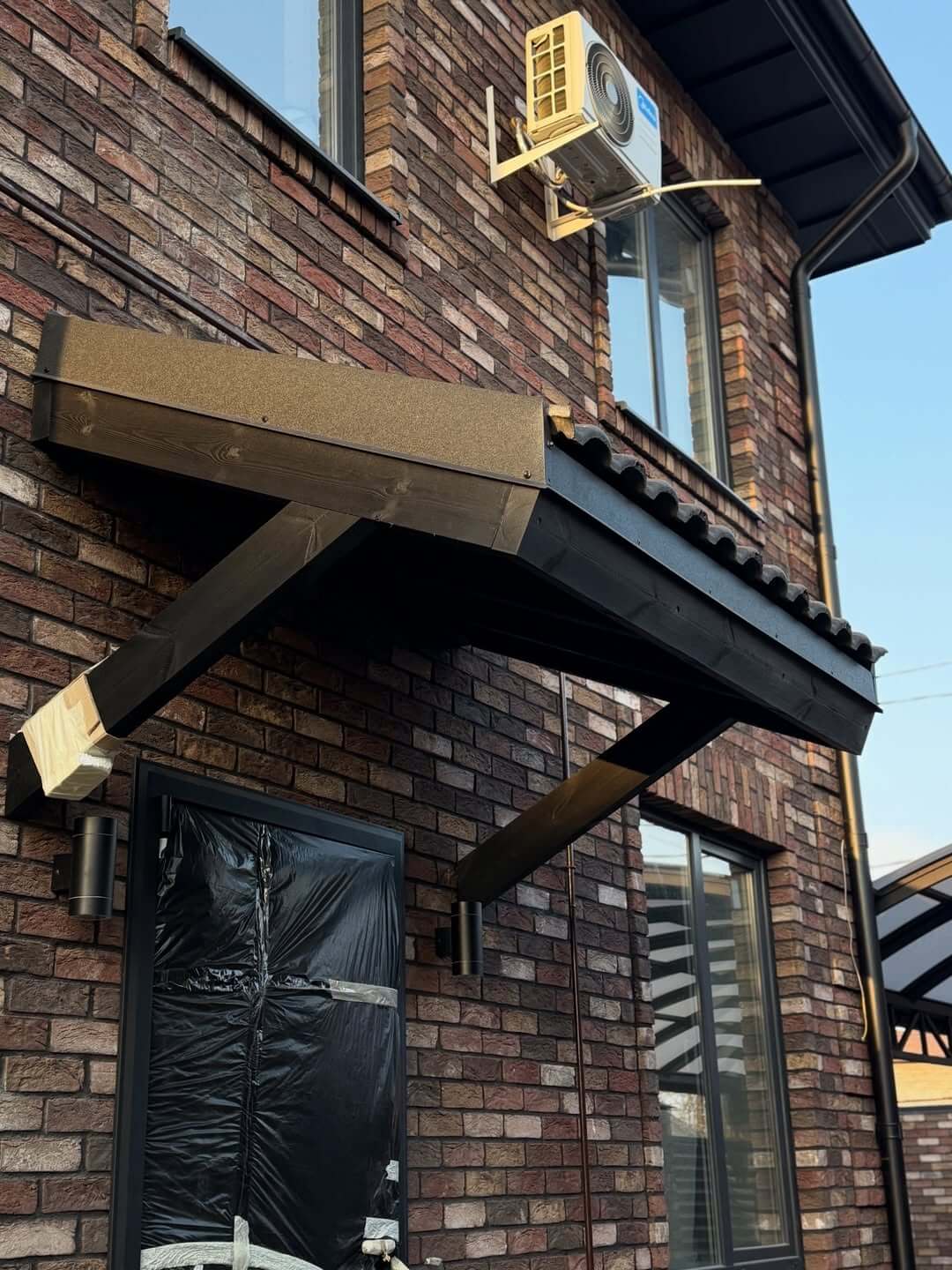 Навес спроектирован и установлен так, чтобы быть функциональным и эстетически привлекательным одновременно. Он защищает от дождя и солнца, гармонирует с кровлей и забором, создавая завершённый вид всей территории.